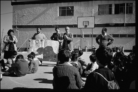 ![]() Students, teachers, and administrators from the local schools of Me'eona (Jewish) and Me'eliyah (Christian) present collaborative artworks to each other at the school in Tarshiha (Moslem), Spring 1988. To view more photographs from his residency in Ma'alot-Tarshiha, as well as images from his travels in Israel and Egypt on the same adventure, click Israel, 1973-1988: War & Peace |
